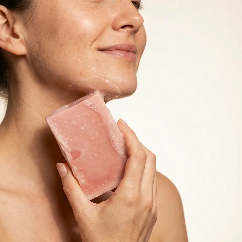 Savon artisanal parfumé à l’huile essentielle de lavandin biologique, à base d’huiles végétales 100% biologiques et d’ocre rose pastel. 135 g