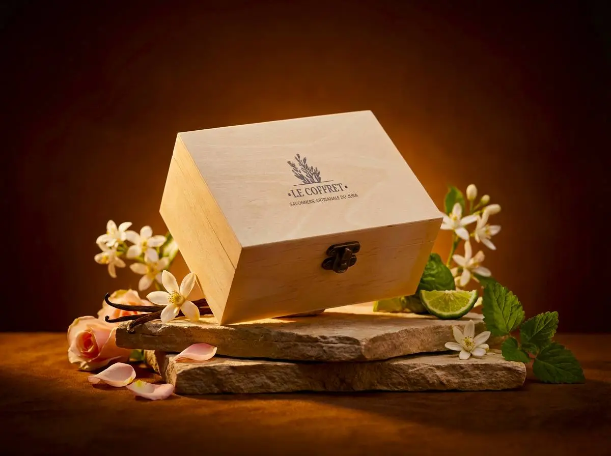 Un coffret artisanal en bois. Quatre savons hydratants et naturels à choisir. Six mois de douceur pour la peau, de gratitude pour la terre.